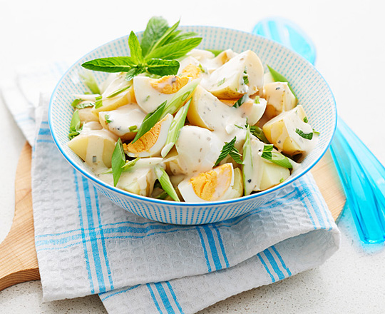 HINT: There are loads of ways to vary a basic potato salad: Toss through strips of ham or if you prefer crispy bacon, chorizo, kranski or prosciutto. Stir through sliced roasted red capsicum or red onion, maybe chunks of avocado or semi sundried tomatoes…even some corn or baby peas. Don’t forget chopped chives and parsley are a great addition too. You can make an amazing potato salad by roasting the potatoes with a drizzle of oil and some rosemary as an alternative to boiling.